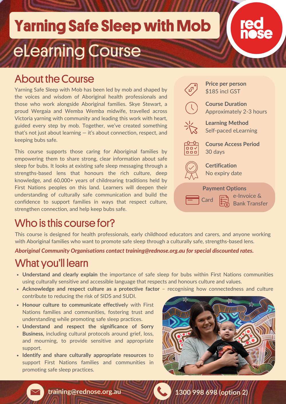 This course supports those caring for Aboriginal families by empowering them to share strong, clear information about safe sleep for bubs. It looks at existing safe sleep messaging through a strengths-based lens that honours the rich culture, deep knowledge, and 60,000+ years of childrearing traditions held by First Nations peoples on this land. Learners will deepen their understanding of culturally safe communication and build the confidence to support families in ways that respect culture, strengthen connection, and help keep bubs safe.